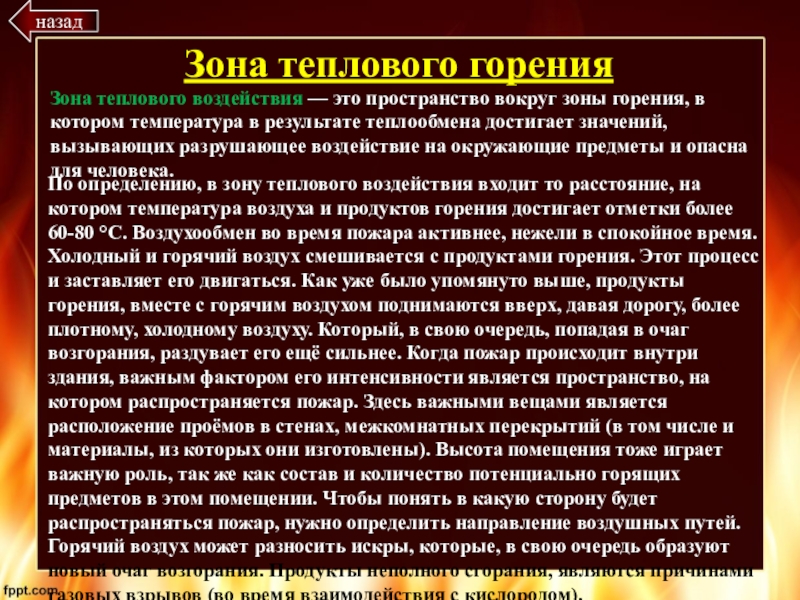 По определению, в зону теплового воздействия входит то расстояние, на котором температура воздуха и продуктов горения достигает отметки более 60-80 °С. Воздухообмен во время пожара активнее, нежели в спокойное время. Холодный и горячий воздух смешивается с продуктами горения. Этот процесс и заставляет его двигаться. Как уже было упомянуто выше, продукты горения, вместе с горячим воздухом поднимаются вверх, давая дорогу, более плотному, холодному воздуху. Который, в свою очередь, попадая в очаг возгорания, раздувает его ещё сильнее. Когда пожар происходит внутри здания, важным фактором его интенсивности является пространство, на котором распространяется пожар. Здесь важными вещами является расположение проёмов в стенах, межкомнатных перекрытий (в том числе и материалы, из которых они изготовлены). Высота помещения тоже играет важную роль, так же как состав и количество потенциально горящих предметов в этом помещении. Чтобы понять в какую сторону будет распространяться пожар, нужно определить направление воздушных путей. Горячий воздух может разносить искры, которые, в свою очередь образуют новый очаг возгорания. Продукты неполного сгорания, являются причинами газовых взрывов (во время взаимодействия с кислородом).