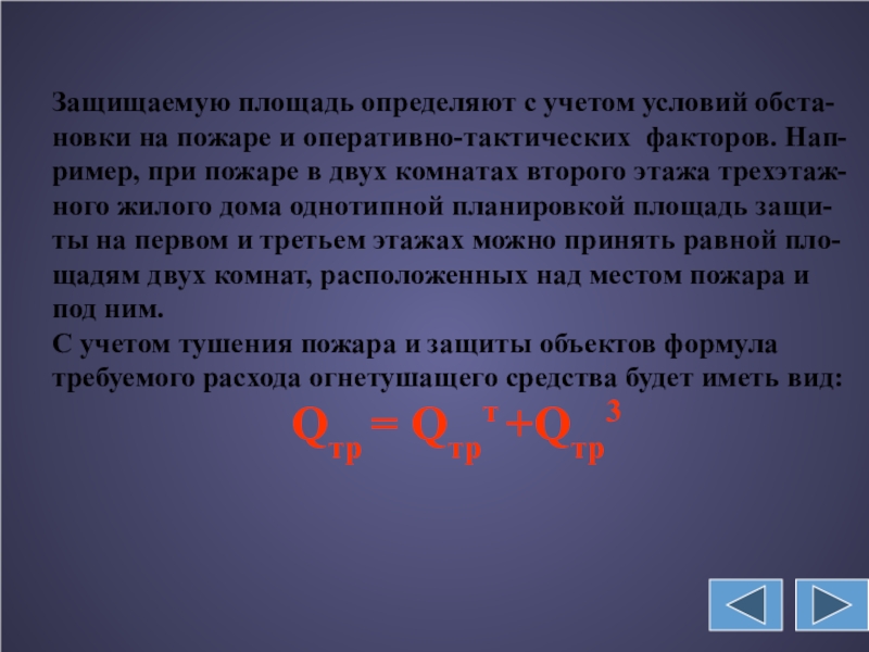 Защищаемую площадь определяют с учетом условий обста-новки на пожаре и оперативно-тактических