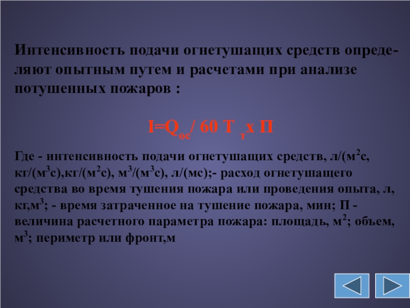 Где - интенсивность подачи огнетушащих средств, л/(м2с, кг/(м3с),кг/(м2с), м3/(м3с), л/(мс);- расход огнетушащего средства во время тушения пожара или проведения опыта, л, кг,м3; - время затраченное на тушение пожара, мин; П - величина расчетного параметра пожара: площадь, м2; объем, м3; периметр или фронт,м