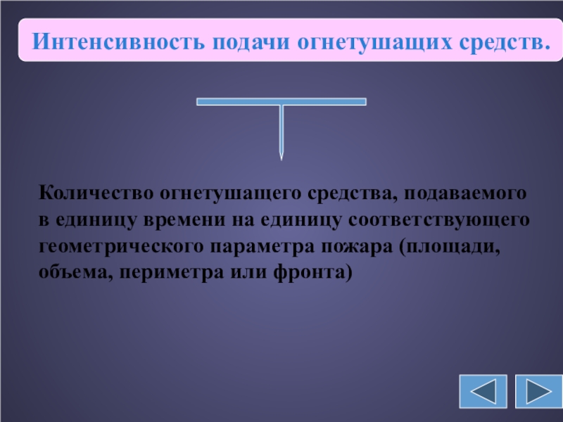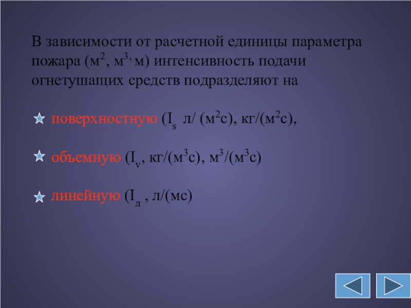 В зависимости от расчетной единицы параметра пожара (м2, м3, м) интенсивность