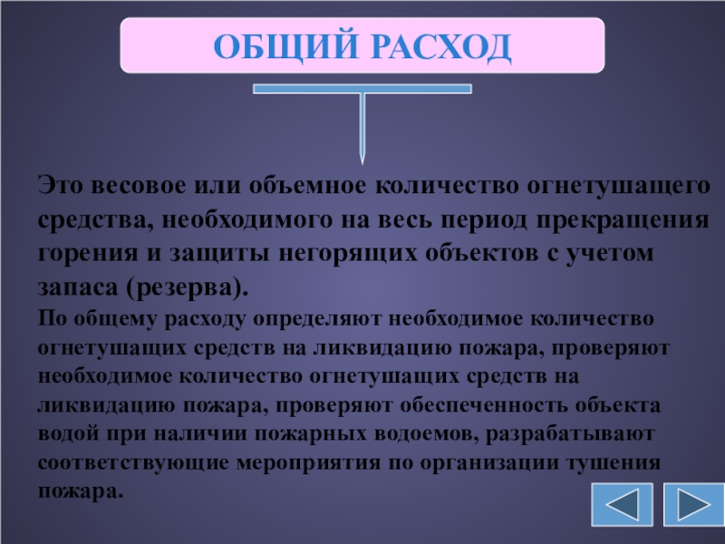 По общему расходу определяют необходимое количество огнетушащих средств на ликвидацию пожара, проверяют необходимое количество огнетушащих средств на ликвидацию пожара, проверяют обеспеченность объекта водой при наличии пожарных водоемов, разрабатывают соответствующие мероприятия по организации тушения пожара.