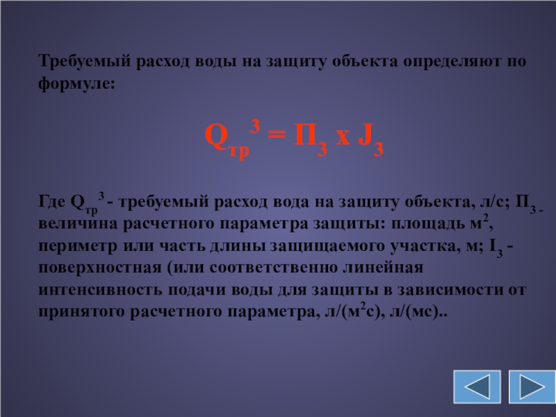 Где Qтр3 - требуемый расход вода на защиту объекта, л/с; П3 - величина расчетного параметра защиты: площадь м2, периметр или часть длины защищаемого участка, м; I3 - поверхностная (или соответственно линейная интенсивность подачи воды для защиты в зависимости от принятого расчетного параметра, л/(м2с), л/(мс)..