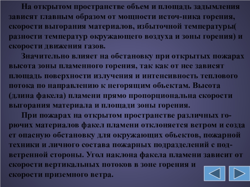 техники и личного состава пожарных подразделений с под-ветренной стороны. Угол наклона факела пламени зависит от скорости вертикальных потоков в зоне горения и