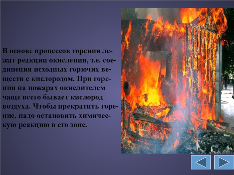 Слайд 4В основе процесса горения лежит реакция окисления исходных горючих веществ с