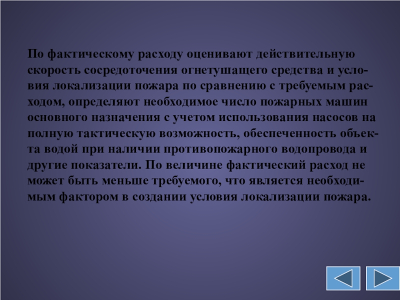 локализации пожара по сравнению с требуемым рас-ходом, определяют необходимое число пожарных машин основного назначения с учетом использования насосов на полную тактическую возможность, обеспеченность объек-та водой при наличии противопожарного водопровода и другие показатели. По величине фактический расход не может быть меньше требуемого, что является необходи-мым фактором в создании условия локализации пожара.
