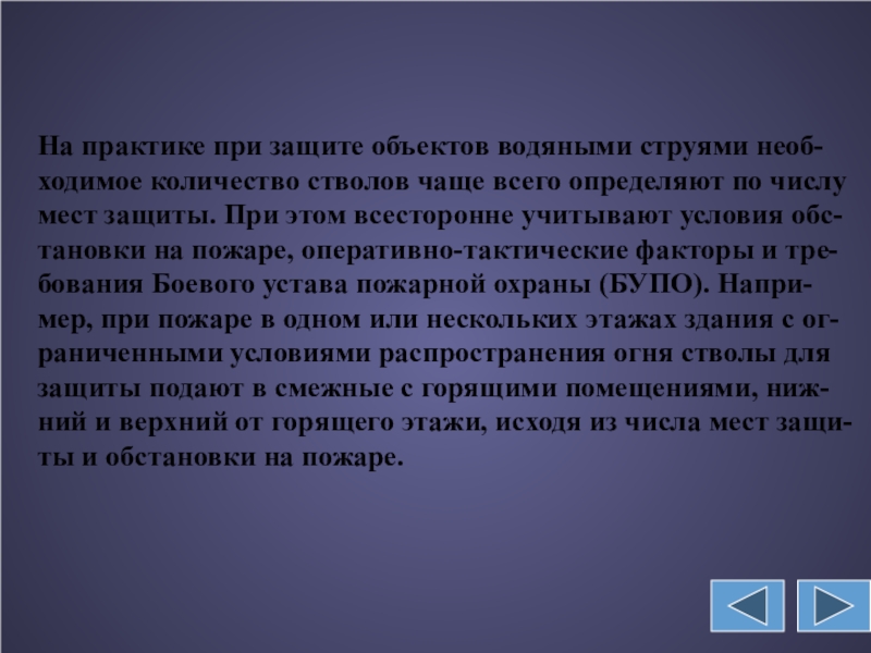 всего определяют по числу мест защиты. При этом всесторонне учитывают условия обс-тановки на пожаре, оперативно-тактические факторы и тре-бования Боевого устава пожарной охраны (БУПО). Напри-мер, при пожаре в одном или нескольких этажах здания с ог-раниченными условиями распространения огня стволы для защиты подают в смежные с горящими помещениями, ниж-ний и верхний от горящего этажи, исходя из числа мест защи-ты и обстановки на пожаре.