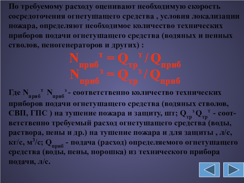 Где Nприбт Nприбз - соответственно количество технических приборов подачи огнетушащего средства (водяных стволов, СВП, ГПС ) на тушение пожара и защиту, шт; Qтрз Qтрт - соот-ветственно требуемый расход огнетушащего средства (воды, раствора, пены и др.) на тушение пожара и для защиты , л/с, кг/с, м3/с; Qприб - подача (расход) определяемого огнетушащего средства (воды, пены, порошка) из технического прибора подачи, л/с.