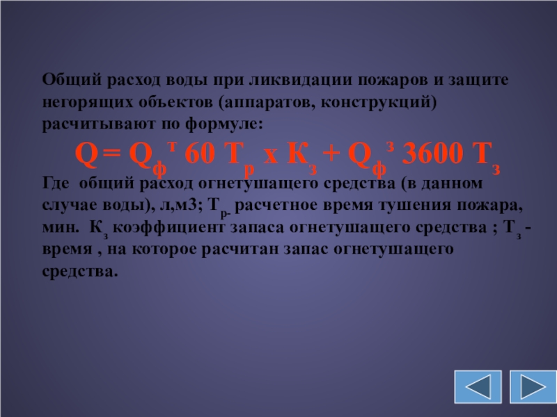 Где общий расход огнетушащего средства (в данном случае воды), л,м3; Тр- расчетное время тушения пожара, мин. Кз коэффициент запаса огнетушащего средства ; Тз - время , на которое расчитан запас огнетушащего средства.