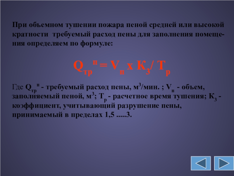 Где Qтрп - требуемый расход пены, м3/мин. ; Vп - объем, заполняемый пеной, м3; Тр - расчетное время тушения; К3 - коэффициент, учитывающий разрушение пены, принимаемый в пределах 1,5 .....3.