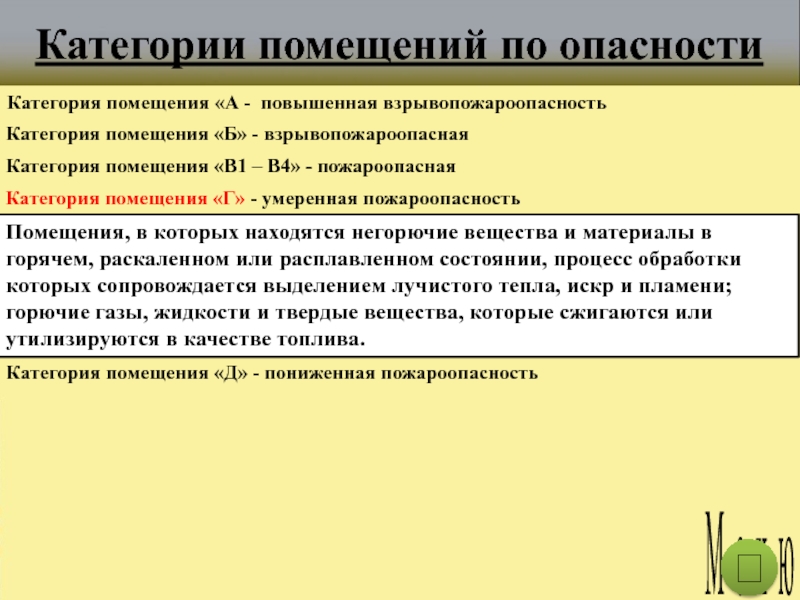 Помещения, в которых находятся негорючие вещества и материалы в горячем, раскаленном или расплавленном состоянии, процесс обработки которых сопровождается выделением лучистого тепла, искр и пламени; горючие газы, жидкости и твердые вещества, которые сжигаются или утилизируются в качестве топлива.