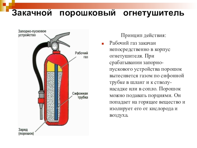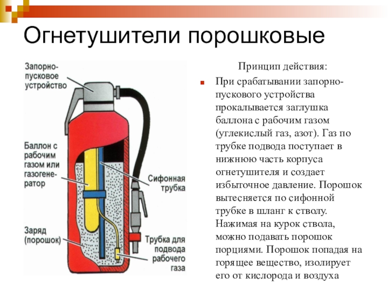 газом (углекислый газ, азот). Газ по трубке подвода поступает в нижнюю часть корпуса огнетушителя и создает избыточное давление. Порошок вытесняется по сифонной трубке в шланг к стволу. Нажимая на курок ствола, можно подавать порошок порциями. Порошок попадая на горящее вещество, изолирует его от кислорода и воздуха