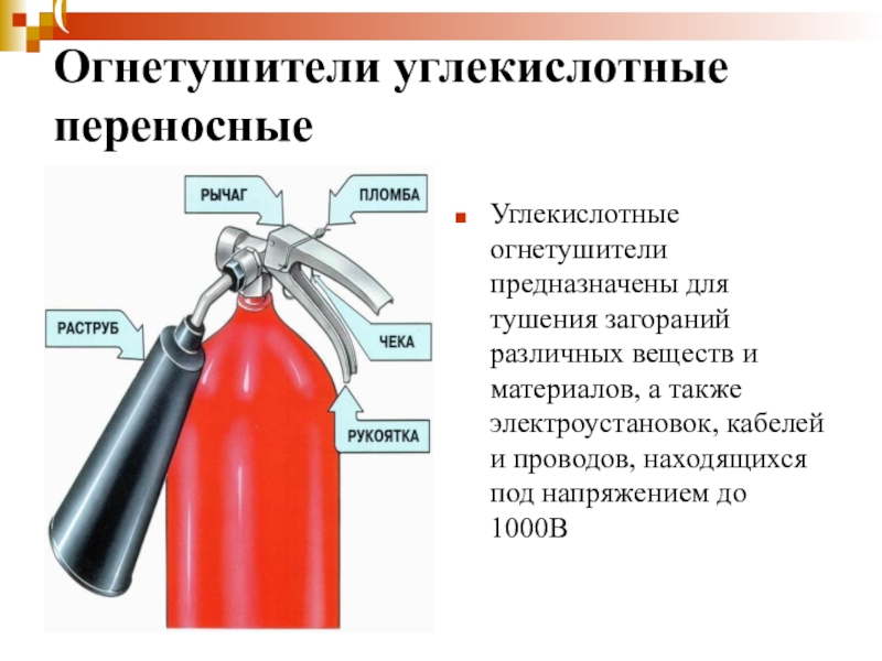 огнетушители предназначены для тушения загораний различных веществ и материалов, а также электроустановок, кабелей и проводов, находящихся под напряжением до 1000В