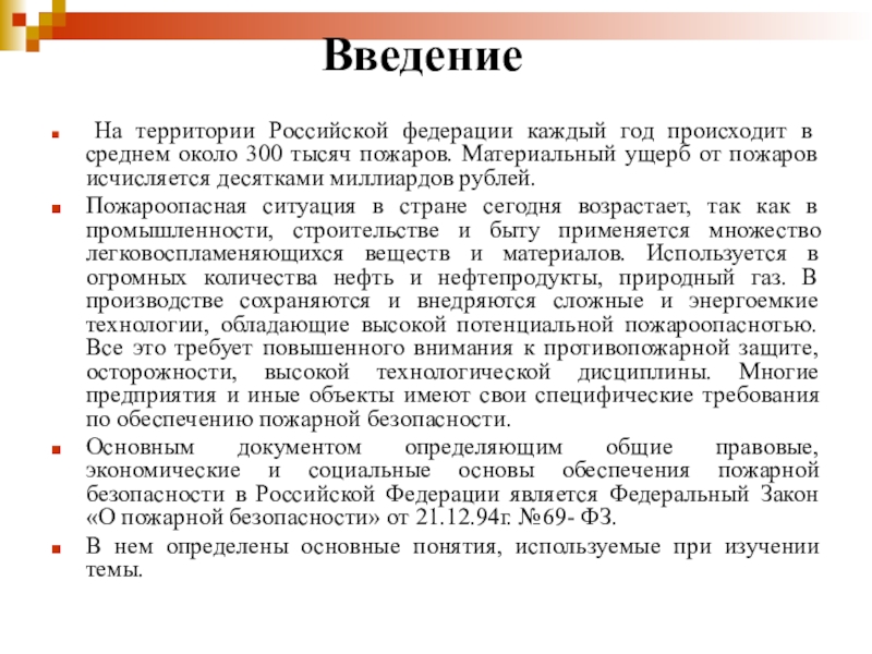 Основным документом определяющим общие правовые, экономические и социальные основы обеспечения пожарной безопасности в Российской Федерации является Федеральный Закон «О пожарной безопасности» от 21.12.94г. №69- ФЗ.