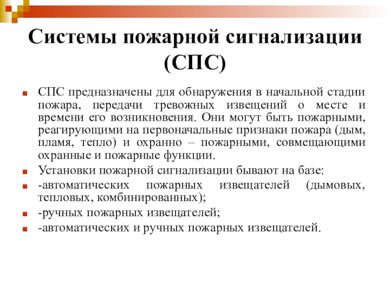пожара, передачи тревожных извещений о месте и времени его возникновения. Они могут быть пожарными, реагирующими на первоначальные признаки пожара (дым, пламя, тепло) и охранно – пожарными, совмещающими охранные и пожарные функции.