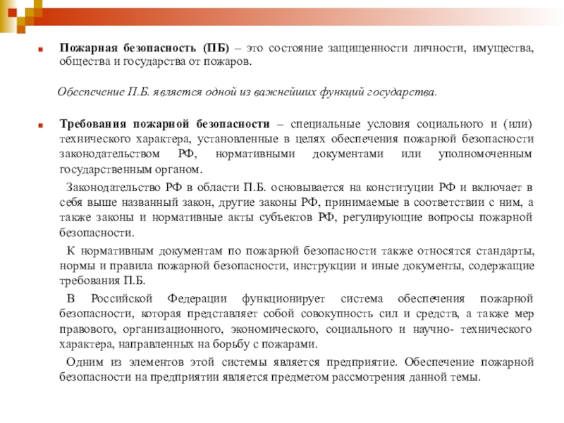Одним из элементов этой системы является предприятие. Обеспечение пожарной безопасности на предприятии является предметом рассмотрения данной темы.