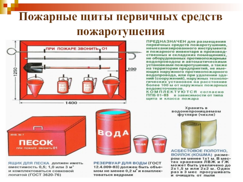 Слайд 19Пожарные щиты первичных средств пожаротушения