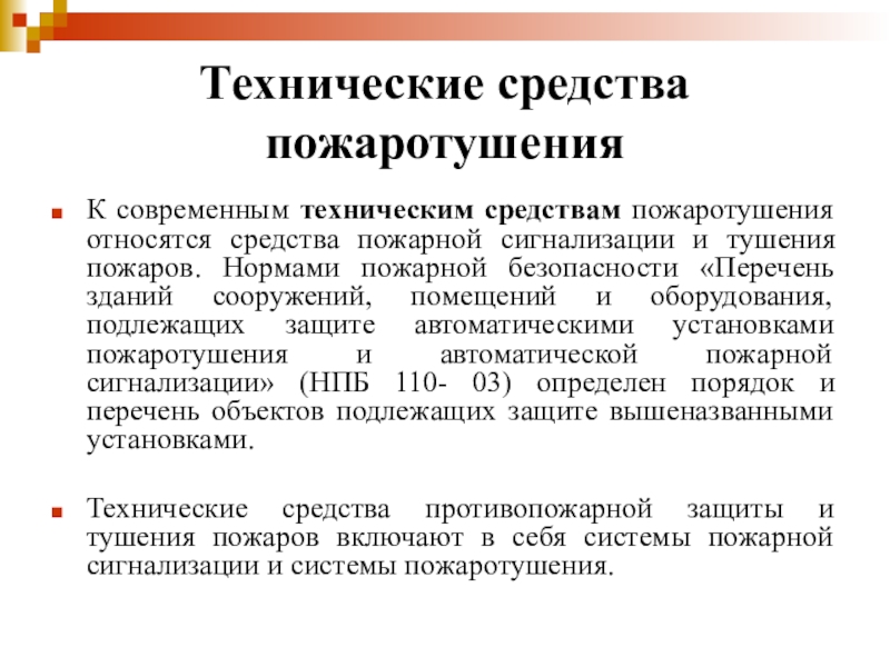 Технические средства противопожарной защиты и тушения пожаров включают в себя системы пожарной сигнализации и системы пожаротушения.