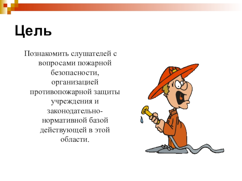 Познакомить слушателей с вопросами пожарной безопасности, организацией противопожарной защиты учреждения и