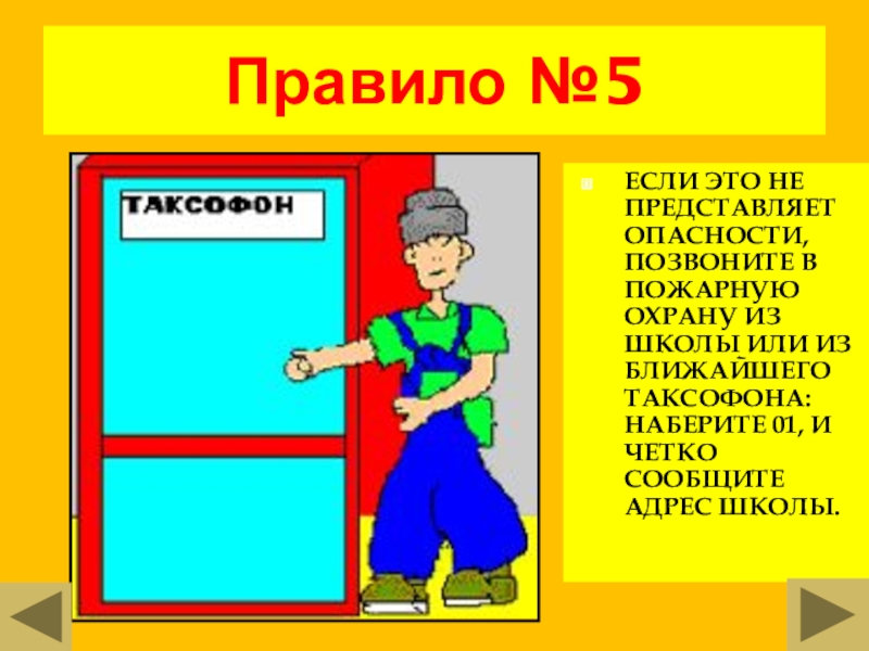 Правило №5ЕСЛИ ЭТО НЕ ПРЕДСТАВЛЯЕТ ОПАСНОСТИ, ПОЗВОНИТЕ В ПОЖАРНУЮ ОХРАНУ ИЗ ШКОЛЫ ИЛИ ИЗ БЛИЖАЙШЕГО ТАКСОФОНА: НАБЕРИТЕ