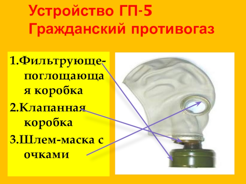 Устройство ГП-5 Гражданский противогаз1.Фильтрующе-поглощающая коробка2.Клапанная коробка3.Шлем-маска с очками
