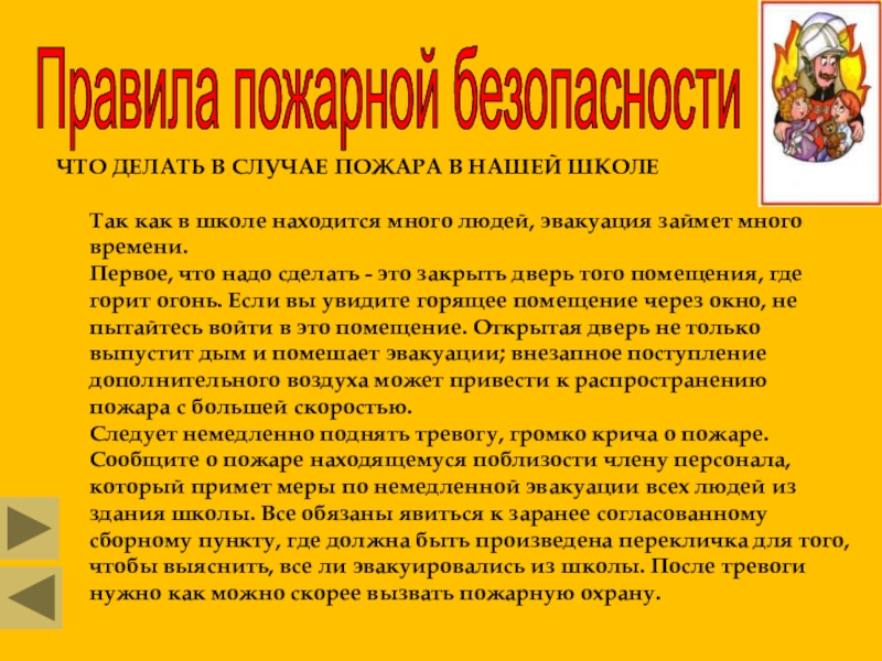 в школе находится много людей, эвакуация займет много времени. Первое, что надо сделать - это закрыть дверь того помещения, где горит огонь. Если вы увидите горящее помещение через окно, не пытайтесь войти в это помещение. Открытая дверь не только выпустит дым и помешает эвакуации; внезапное поступление дополнительного воздуха может привести к распространению пожара с большей скоростью. Следует немедленно поднять тревогу, громко крича о пожаре. Сообщите о пожаре находящемуся поблизости члену персонала, который примет меры по немедленной эвакуации всех людей из здания школы. Все обязаны явиться к заранее согласованному сборному пункту, где должна быть произведена перекличка для того, чтобы выяснить, все ли эвакуировались из школы. После тревоги нужно как можно скорее вызвать пожарную охрану.