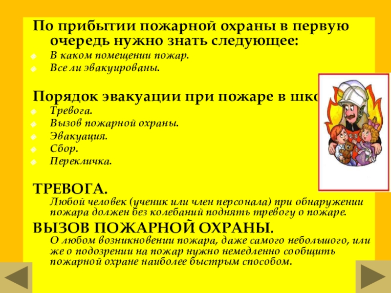 Слайд 13По прибытии пожарной охраны в первую очередь нужно знать следующее: