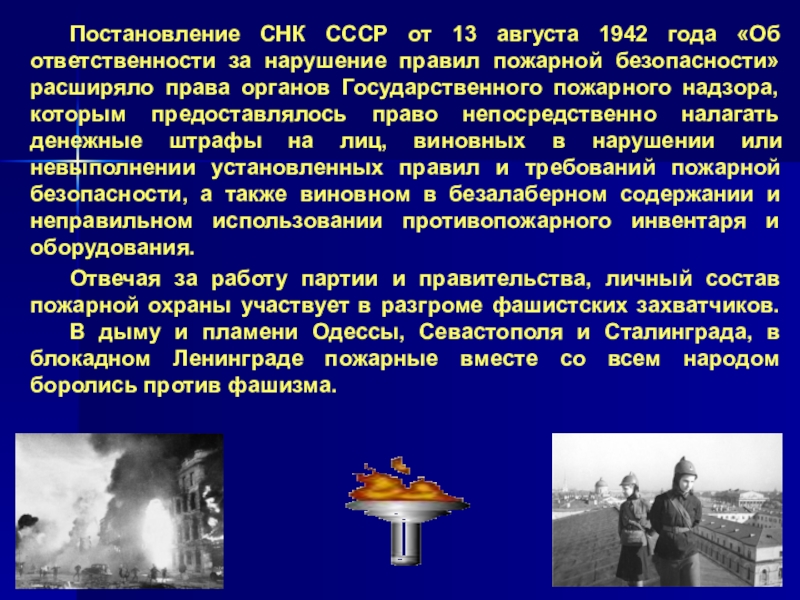 Отвечая за работу партии и правительства, личный состав пожарной охраны участвует в разгроме фашистских захватчиков. В дыму и пламени Одессы, Севастополя и Сталинграда, в блокадном Ленинграде пожарные вместе со всем народом боролись против фашизма.