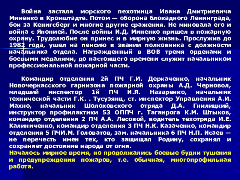 Командир отделения 2й ПЧ Г.И. Деркаченко, начальник Новочеркасского гарнизона пожарной охраны А.Д. Черновол, младший инспектор 1й ПЧ И.Я. Назаренко, начальник технической части Г.К. . Тусузянц, ст. инспектор Управления А.И. Махно, начальник Шолоховского отряда Д.А. Гнилицкий, инструктор профилактики 53 ОППЧ г. Таганрога К.М. Штыков, командир отделения 2 ПЧ А.А. Лесовой, водитель техотряда И.Е. Калиниченко, командир отделения 3 ПЧ Н.К. Казаченко, командир отделения 5 ПЧИ.М. Головатов, зам. начальника 6 ПЧ Н.П. Исаев — не перечесть имен тех, кто защищал Родину, сохранял и сохраняет достояние народа от огня.