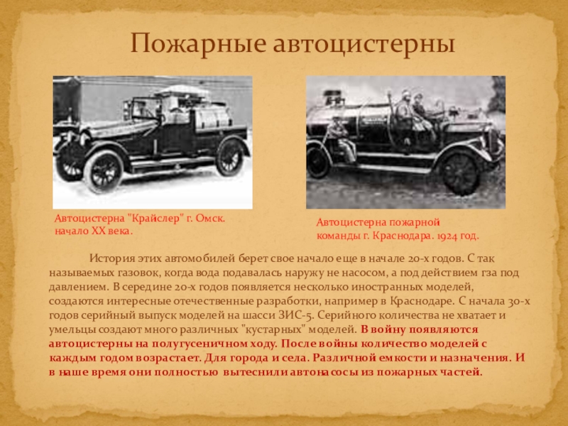 С так называемых газовок, когда вода подавалась наружу не насосом, а под действием гза под давлением. В середине 20-х годов появляется несколько иностранных моделей, создаются интересные отечественные разработки, например в Краснодаре. С начала 30-х годов серийный выпуск моделей на шасси ЗИС-5. Серийного количества не хватает и умельцы создают много различных "кустарных" моделей. В войну появляются автоцистерны на полугусеничном ходу. После войны количество моделей с каждым годом возрастает. Для города и села. Различной емкости и назначения. И в наше время они полностью вытеснили автонасосы из пожарных частей.