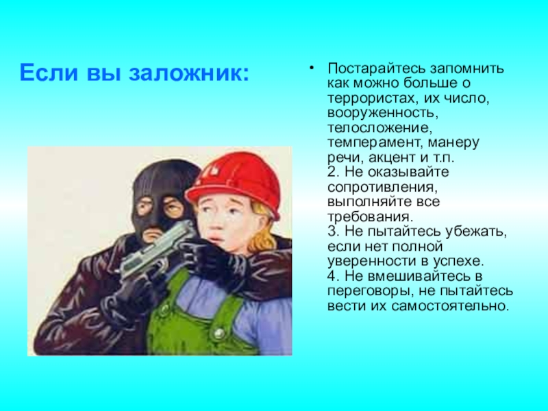 Постарайтесь запомнить как можно больше о террористах, их число, вооруженность, телосложение, темперамент, манеру речи, акцент и т.п.