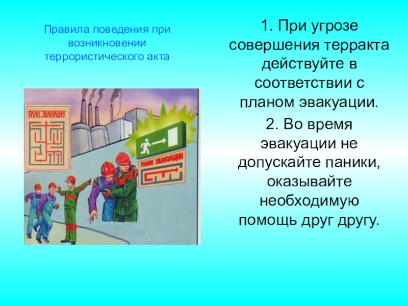 1. При угрозе совершения терракта действуйте в соответствии с планом эвакуации.2. Во время эвакуации не допускайте паники,