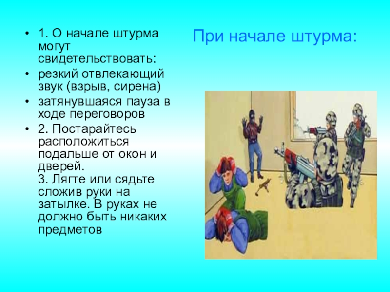 1. О начале штурма могут свидетельствовать: резкий отвлекающий звук (взрыв, сирена)затянувшаяся пауза в ходе переговоров2. Постарайтесь расположиться