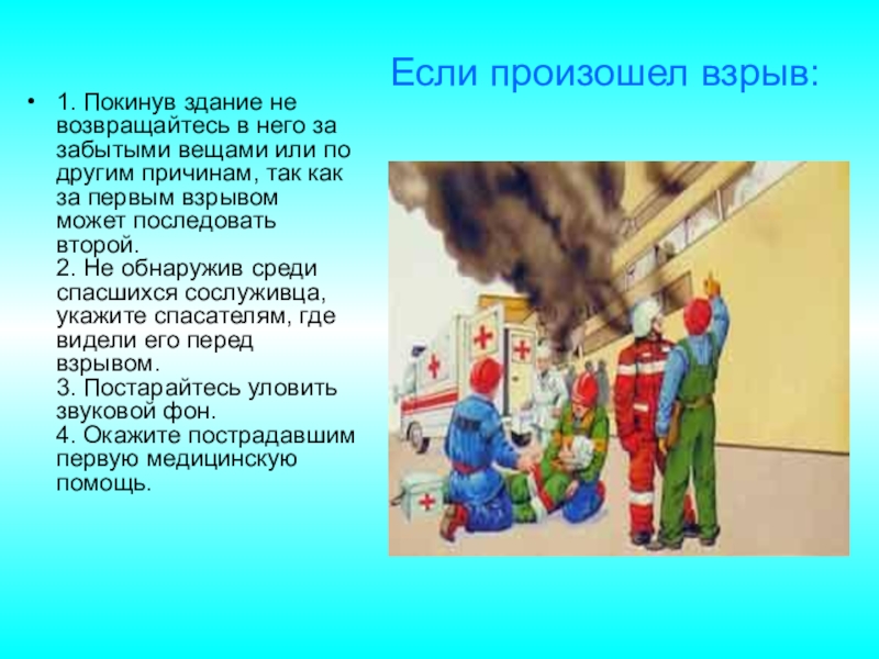 по другим причинам, так как за первым взрывом может последовать второй. 2. Не обнаружив среди спасшихся сослуживца, укажите спасателям, где видели его перед взрывом. 3. Постарайтесь уловить звуковой фон. 4. Окажите пострадавшим первую медицинскую помощь.