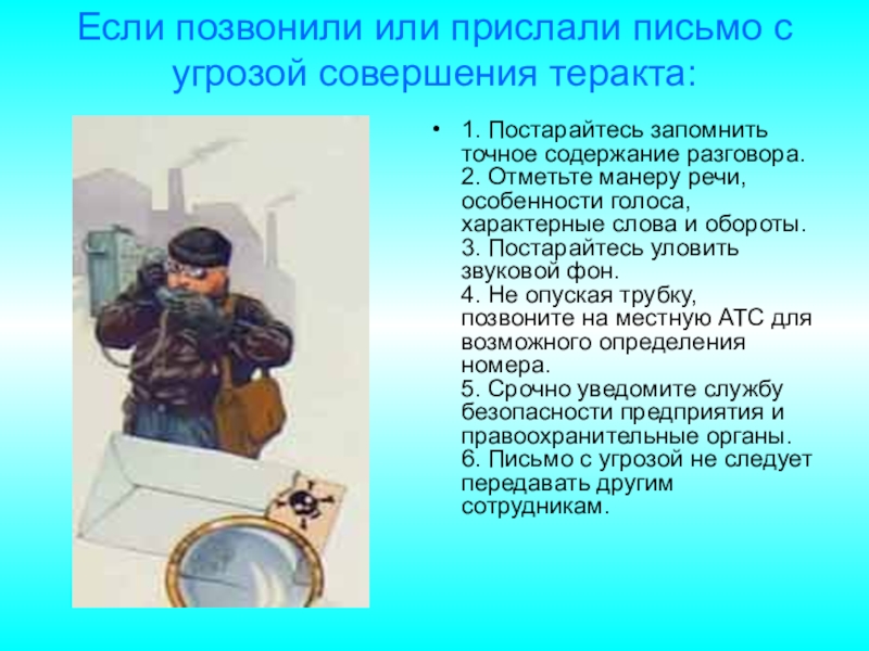 точное содержание разговора. 2. Отметьте манеру речи, особенности голоса, характерные слова и обороты. 3. Постарайтесь уловить звуковой фон. 4. Не опуская трубку, позвоните на местную АТС для возможного определения номера. 5. Срочно уведомите службу безопасности предприятия и правоохранительные органы. 6. Письмо с угрозой не следует передавать другим сотрудникам.