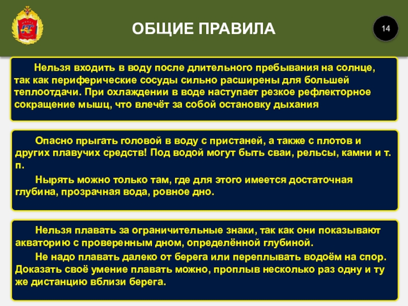 Нельзя входить в воду после длительного пребывания на солнце, так как периферические сосуды сильно расширены для большей теплоотдачи. При охлаждении в воде наступает резкое рефлекторное сокращение мышц, что влечёт за собой остановку дыхания