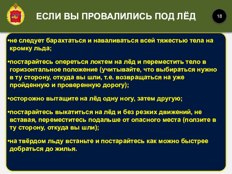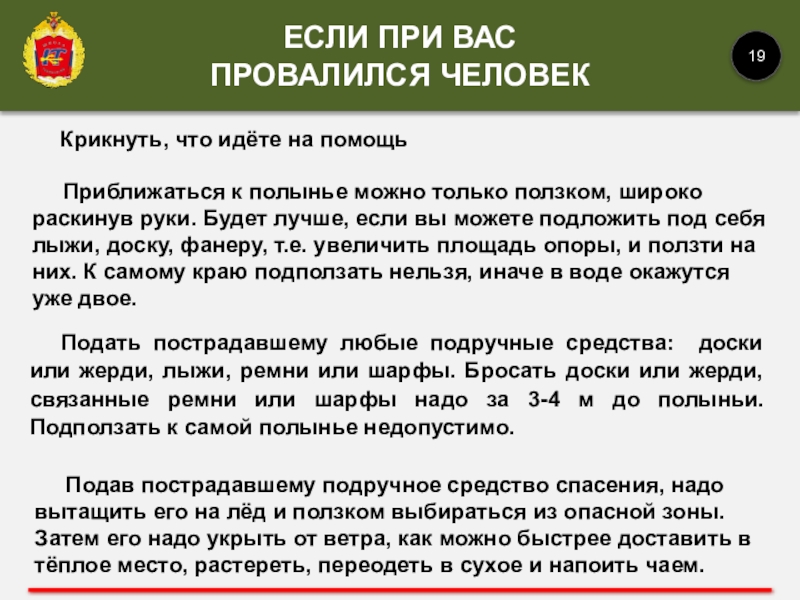 Подав пострадавшему подручное средство спасения, надо вытащить его на лёд и ползком выбираться из опасной зоны. Затем его надо укрыть от ветра, как можно быстрее доставить в тёплое место, растереть, переодеть в сухое и напоить чаем.