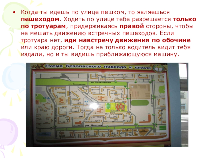 улице тебе разрешается только по тротуарам, придерживаясь правой стороны, чтобы не мешать движению встречных пешеходов. Если тротуара нет, иди навстречу движения по обочине или краю дороги. Тогда не только водитель видит тебя издали, но и ты видишь приближающуюся машину.