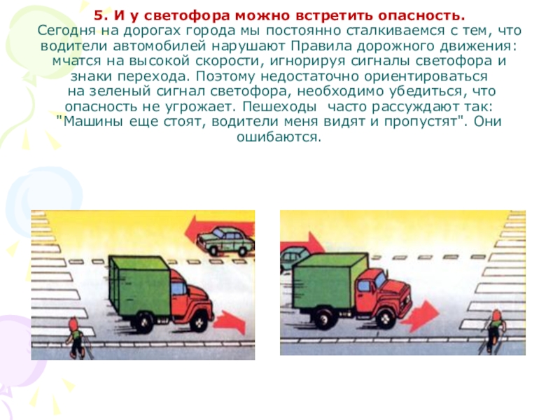 на зеленый сигнал светофора, необходимо убедиться, что опасность не угрожает. Пешеходы часто рассуждают так: "Машины еще стоят, водители меня видят и пропустят". Они ошибаются.