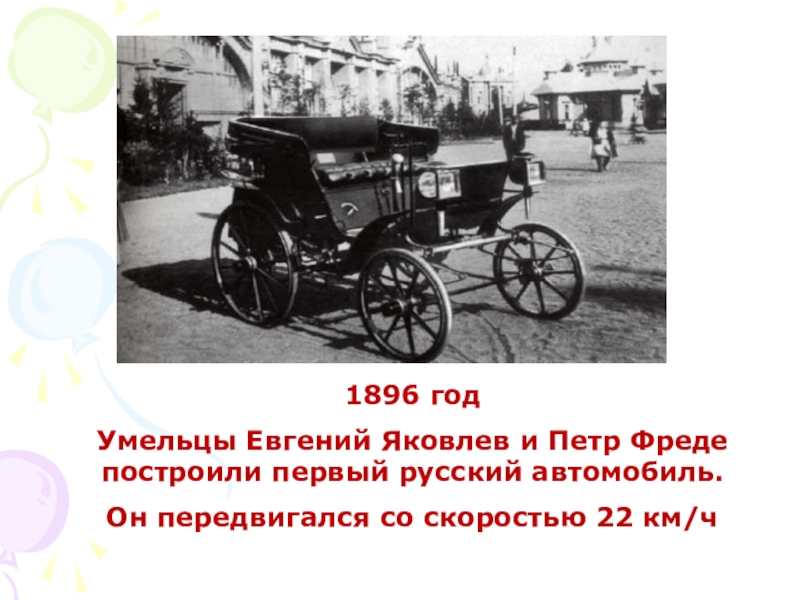 Умельцы Евгений Яковлев и Петр Фреде построили первый русский автомобиль.