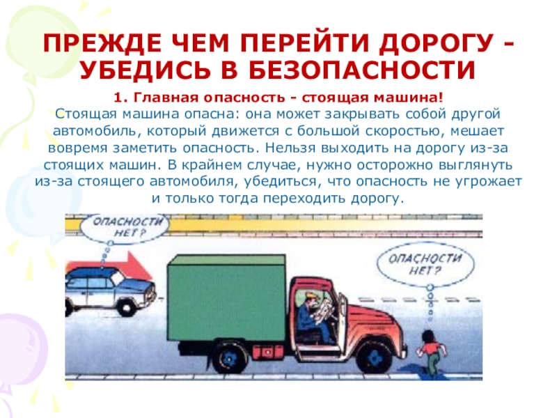 Стоящая машина опасна: она может закрывать собой другой автомобиль, который движется с большой скоростью, мешает вовремя заметить опасность. Нельзя выходить на дорогу из-за стоящих машин. В крайнем случае, нужно осторожно выглянуть из-за стоящего автомобиля, убедиться, что опасность не угрожает и только тогда переходить дорогу.