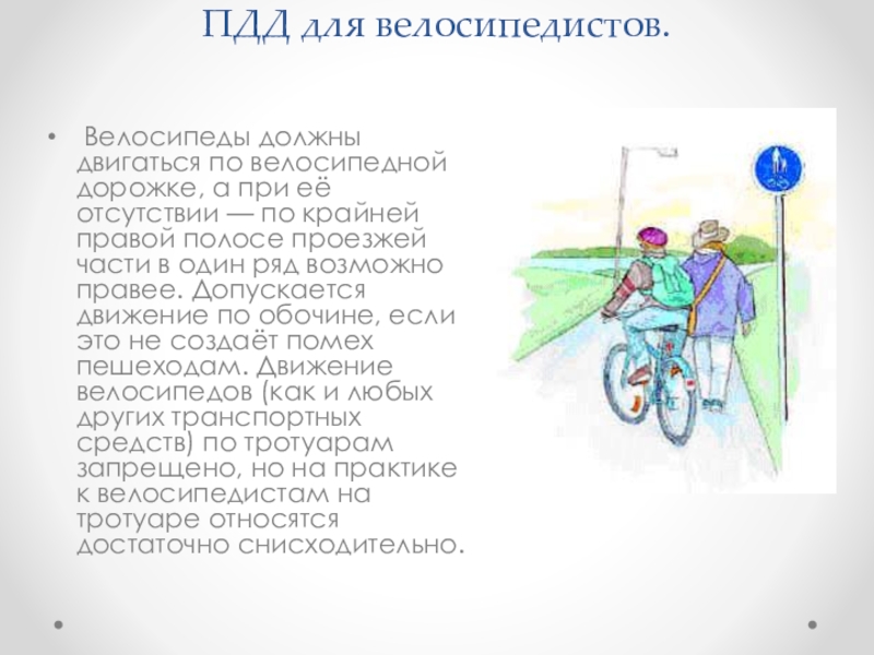 отсутствии — по крайней правой полосе проезжей части в один ряд возможно правее. Допускается движение по обочине, если это не создаёт помех пешеходам. Движение велосипедов (как и любых других транспортных средств) по тротуарам запрещено, но на практике к велосипедистам на тротуаре относятся достаточно снисходительно.