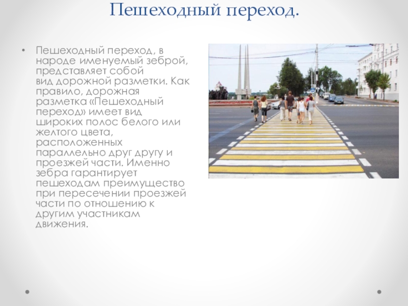Пешеходный переход, в народе именуемый зеброй, представляет собой вид дорожной разметки.