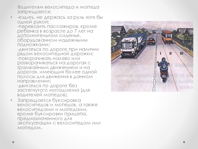 Слайд 10 Водителям велосипеда и мопеда запрещается: