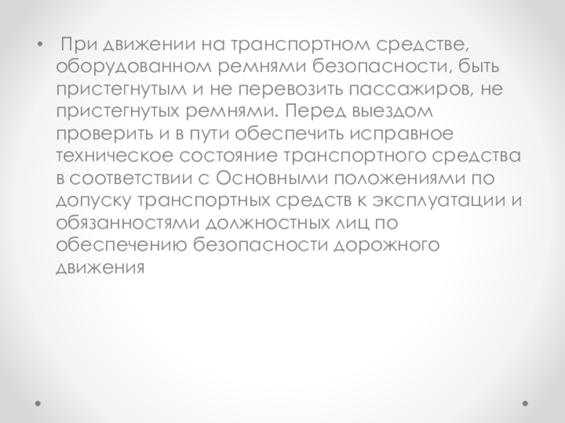 не перевозить пассажиров, не пристегнутых ремнями. Перед выездом проверить и в пути обеспечить исправное техническое состояние транспортного средства в соответствии с Основными положениями по допуску транспортных средств к эксплуатации и обязанностями должностных лиц по обеспечению безопасности дорожного движения