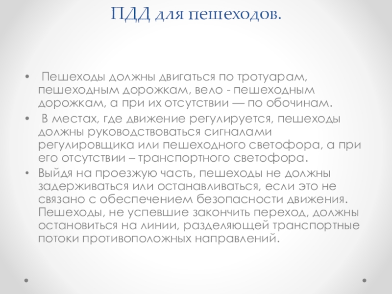 Выйдя на проезжую часть, пешеходы не должны задерживаться или останавливаться, если это не связано с обеспечением безопасности движения. Пешеходы, не успевшие закончить переход, должны остановиться на линии, разделяющей транспортные потоки противоположных направлений.