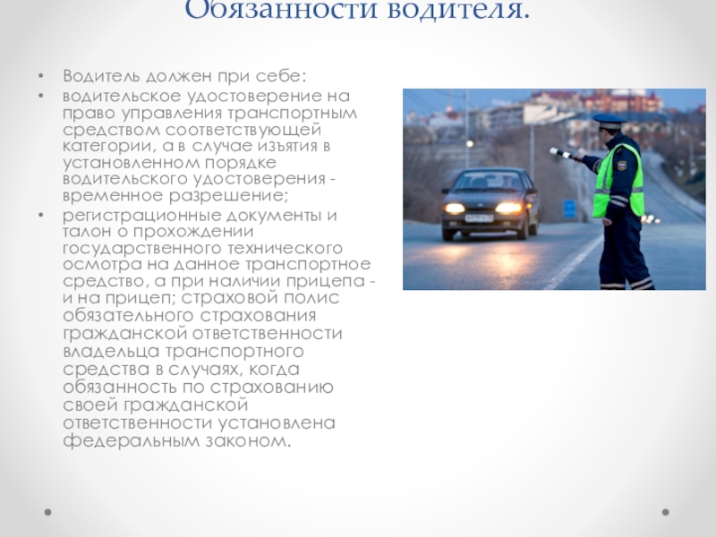 регистрационные документы и талон о прохождении государственного технического осмотра на данное транспортное средство, а при наличии прицепа - и на прицеп; страховой полис обязательного страхования гражданской ответственности владельца транспортного средства в случаях, когда обязанность по страхованию своей гражданской ответственности установлена федеральным законом.