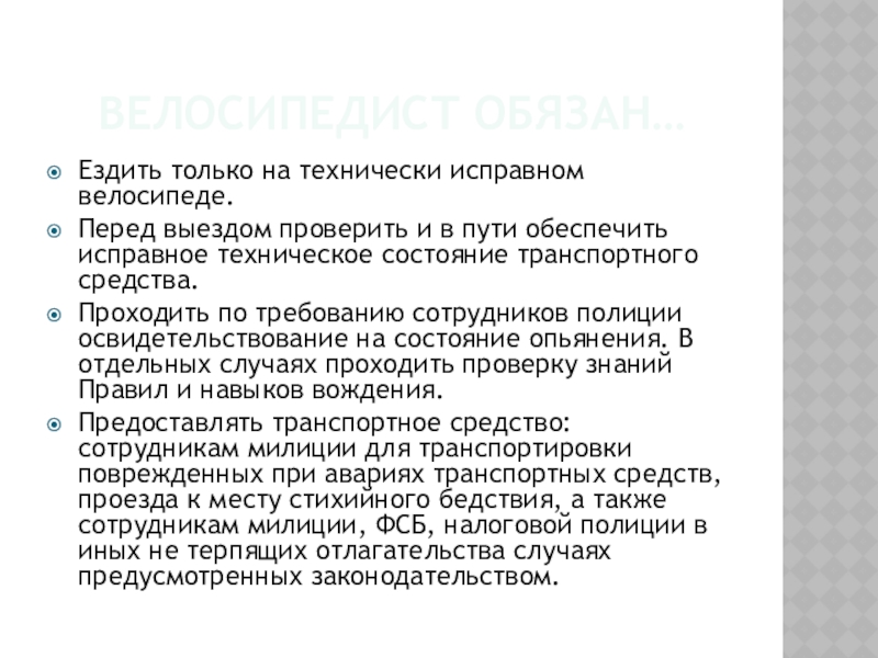 Предоставлять транспортное средство: сотрудникам милиции для транспортировки поврежденных при авариях транспортных средств, проезда к месту стихийного бедствия, а также сотрудникам милиции, ФСБ, налоговой полиции в иных не терпящих отлагательства случаях предусмотренных законодательством.