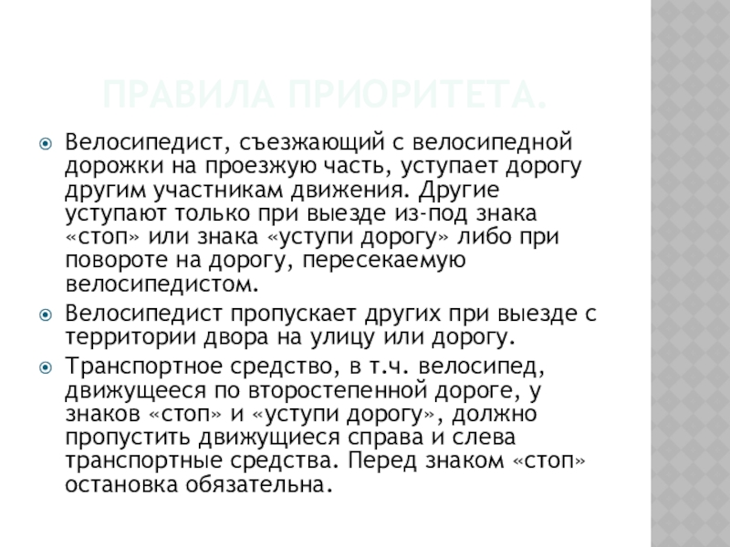 другим участникам движения. Другие уступают только при выезде из-под знака «стоп» или знака «уступи дорогу» либо при повороте на дорогу, пересекаемую велосипедистом.