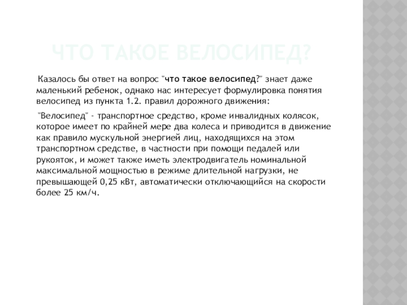 такое велосипед?" знает даже маленький ребенок, однако нас интересует формулировка понятия велосипед из пункта 1.2. правил дорожного движения: