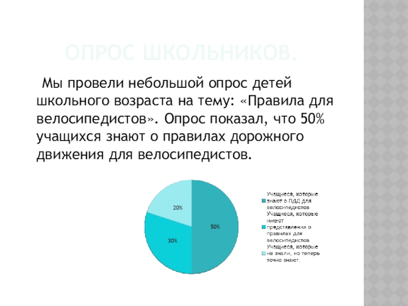 тему: «Правила для велосипедистов». Опрос показал, что 50% учащихся знают о правилах дорожного движения для велосипедистов.